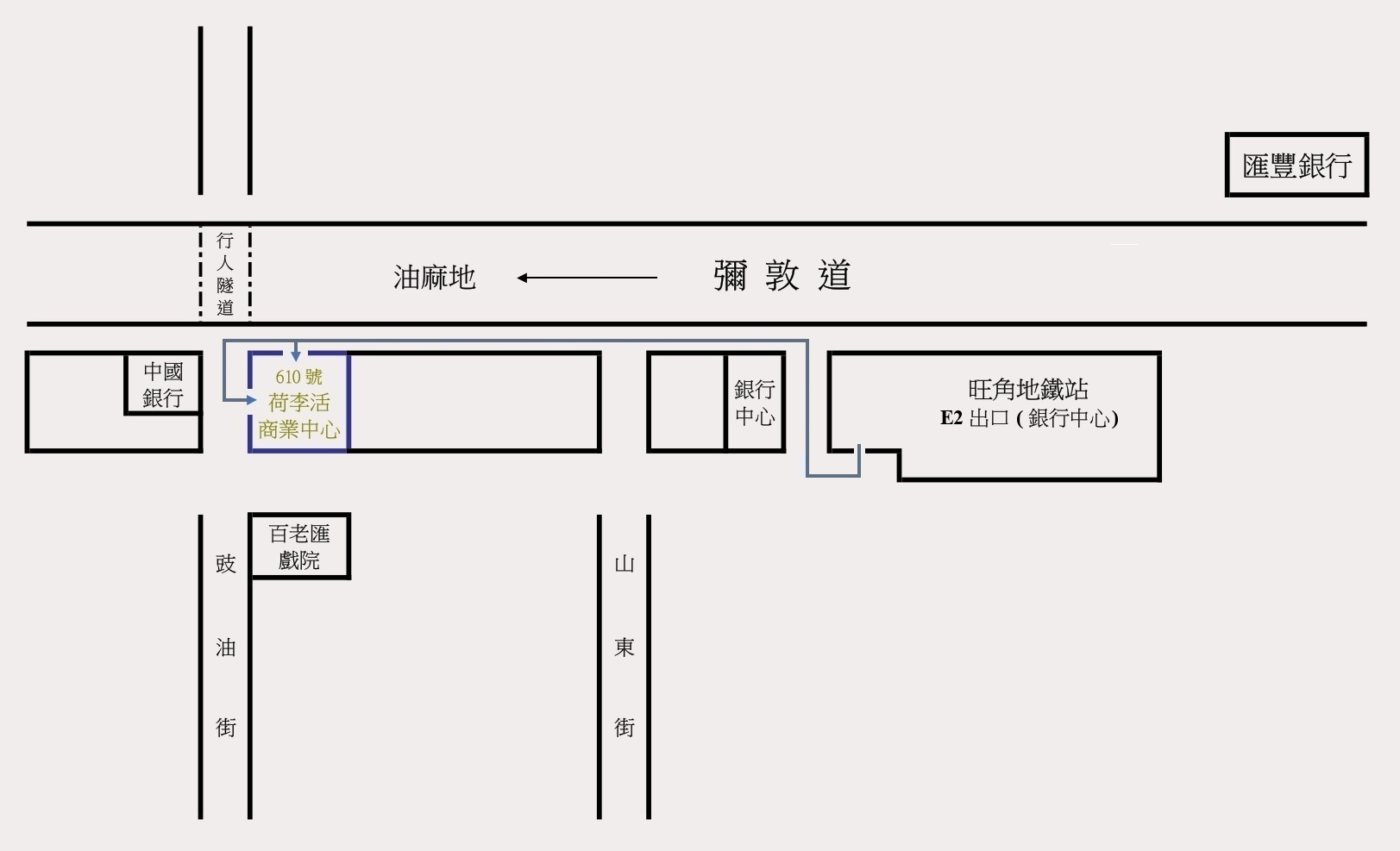 從旺角地鐵站E2(銀行中心)出口,沿彌敦道往油麻地方向步行約3-5分鐘(經過山東街)便抵達荷李活商業中心。入口在彌敦道或豉油街(中國銀行對面)。