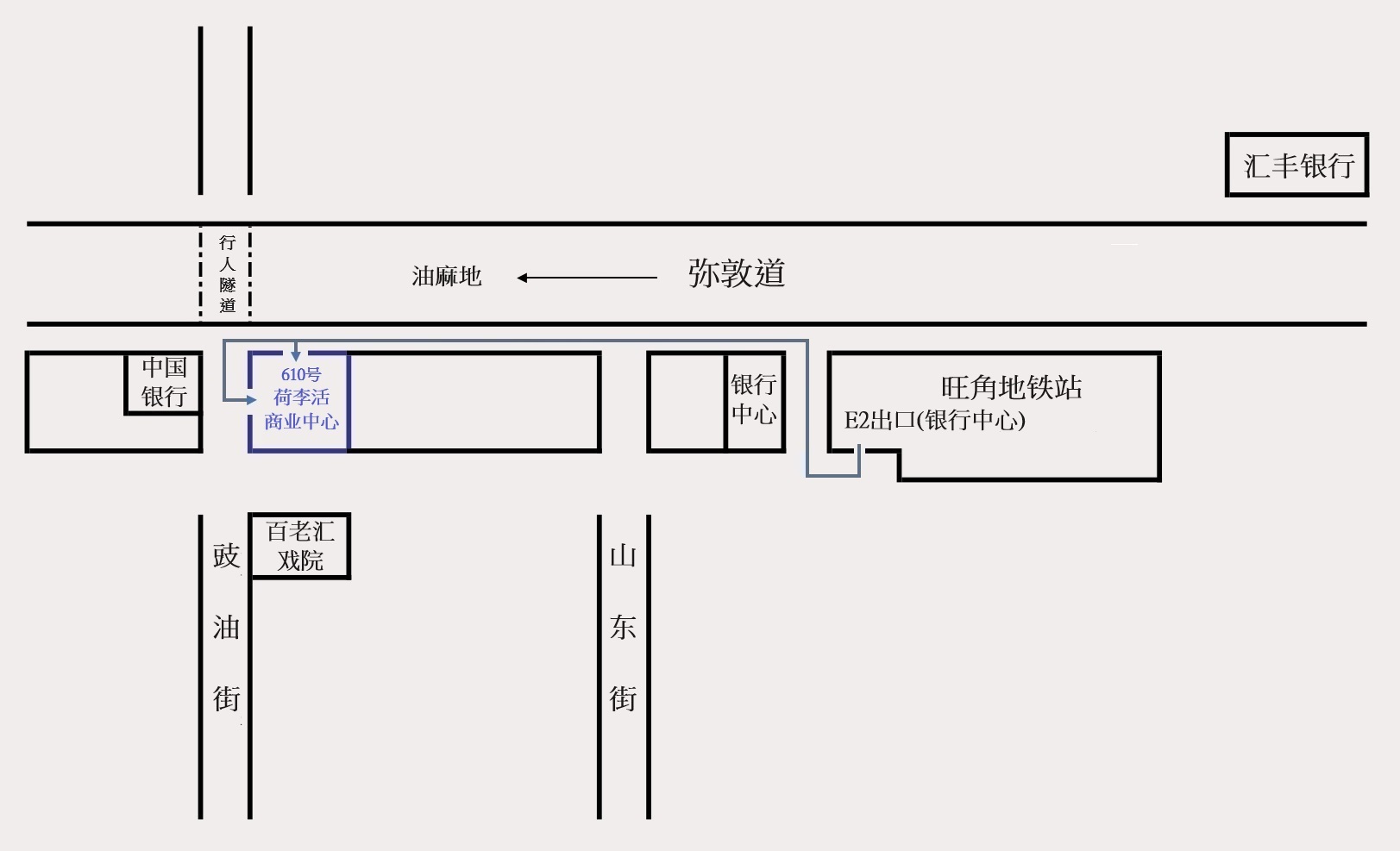 从旺角地铁站E2(银行中心)出口,沿弥敦道往油麻地方向步行约3-5分钟(经过山东街)便抵达荷李活商业中心。入口在弥敦道或豉油街(中国银行对面)。